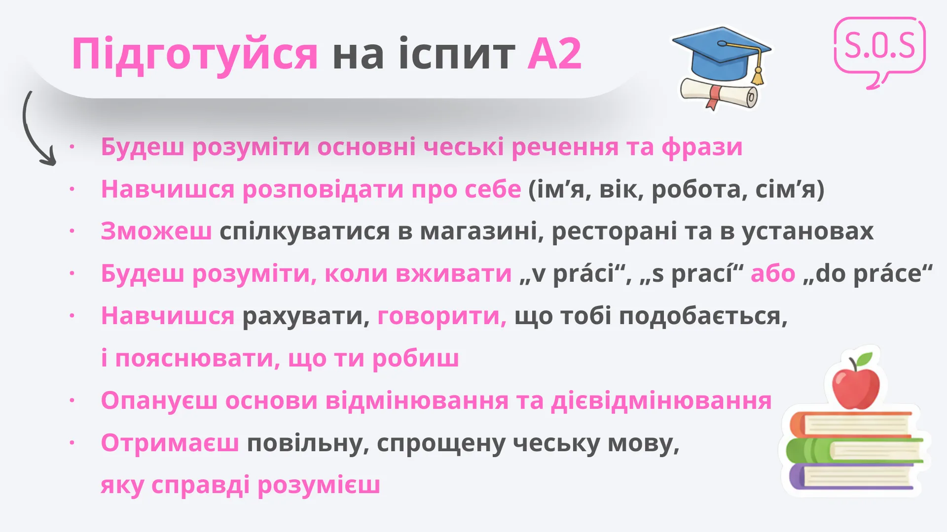Після курсу ти опanuєш чеську мову на рівні A0–A1+